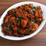 Crispy paneer 65 tossed in spicy South Indian masala with curry leaves and green chillies.